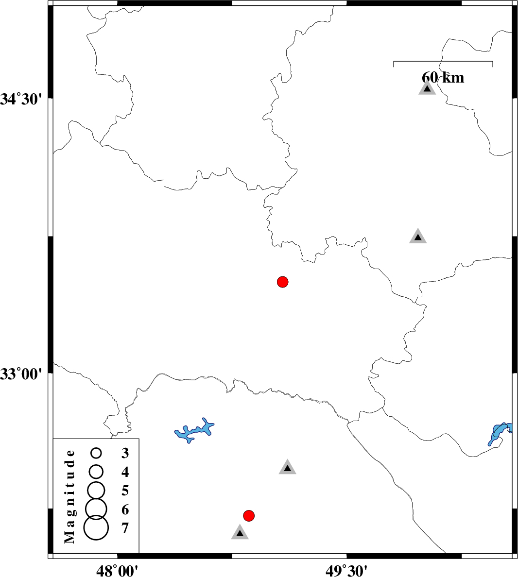 2019/04/28 | 00:07:20.8 | 04:37:20.8 | 33.5 | 49.08 | 16 | ML:3.2 | Lorestan Province, 2 km of Dorud | ||