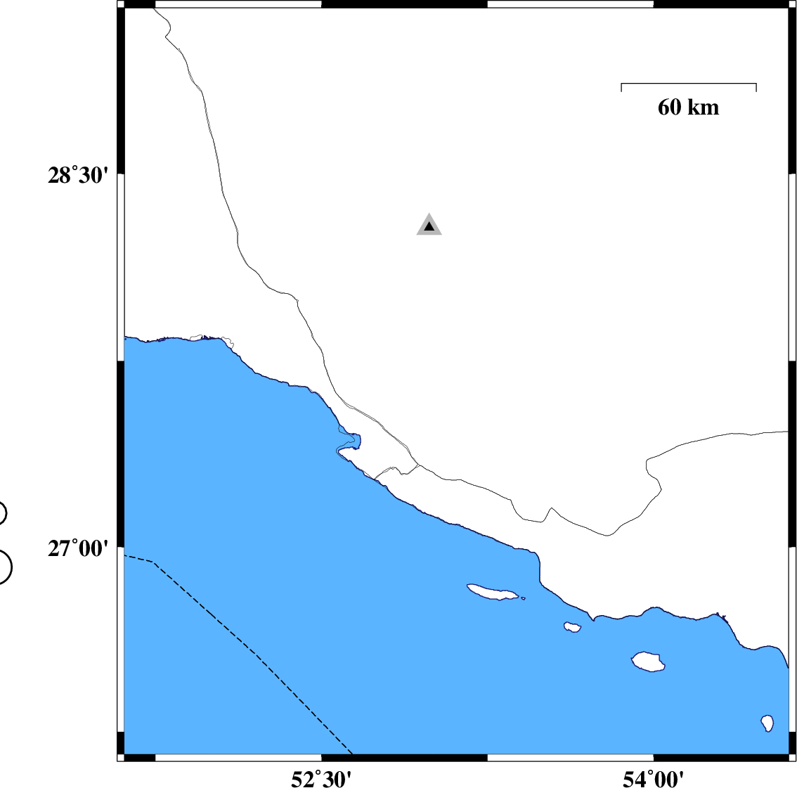 2019/04/28 | 22:19:19.1 | 02:49:19.1 | 27.66 | 53.11 | 16 | Mb:4 | Fars Province, 25 km North-East of Mehr |