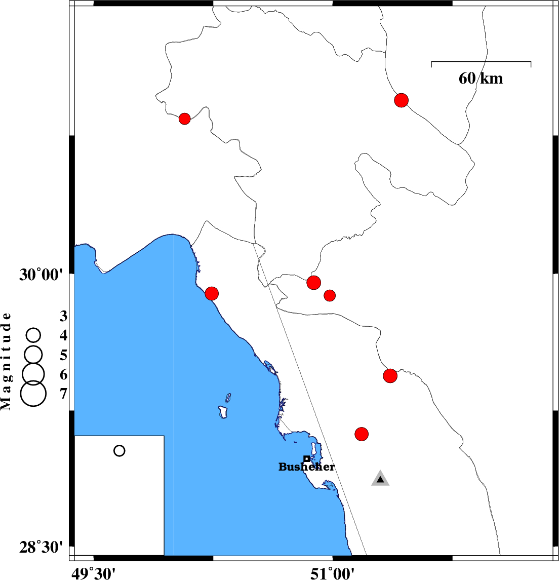 2019/04/19 | 00:57:45.5 | 05:27:45.5 | 29.12 | 51.18 | 5 | ML:3.8 | Bushehr Province, 16 km South of Borazjan |