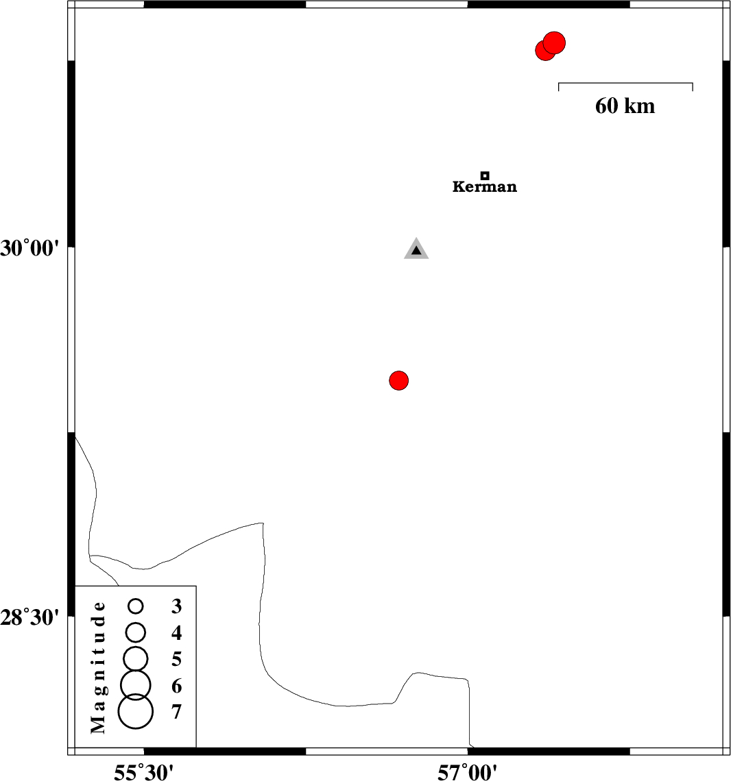 2019/04/16 | 22:43:48.4 | 03:13:48.4 | 30.79 | 57.36 | 10 | Mb:4.3 | Kerman Province, 62 km North-East of Kerman |