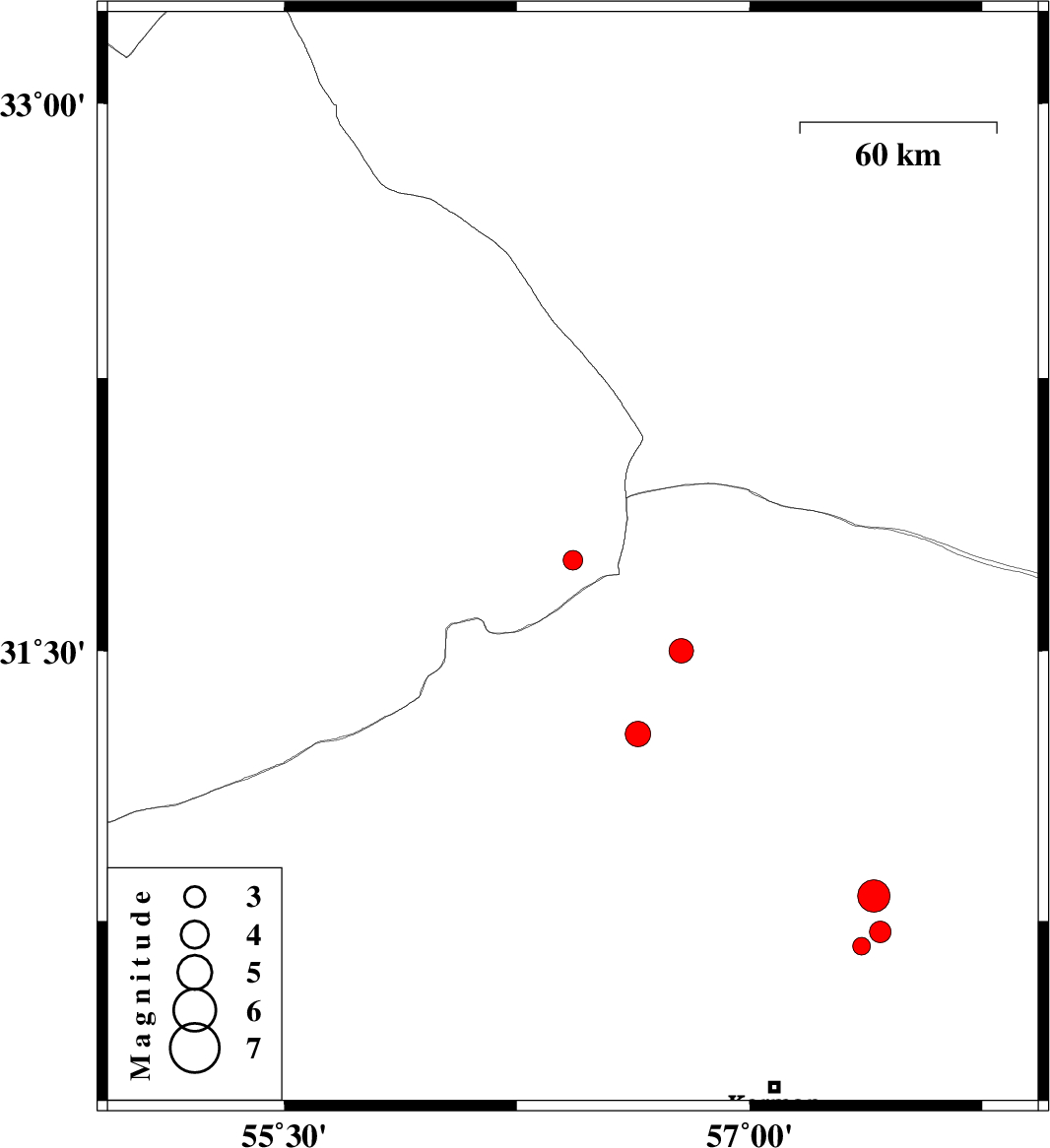 2019/05/11 | 11:39:59.9 | 16:09:59.9 | 31.5 | 56.78 | 7 | ML:3.5 | Kerman Province, 26 km North of Ravar | ||