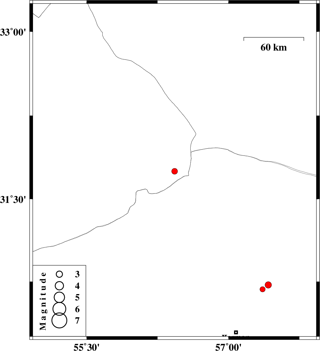 2019/05/12 | 23:32:52.7 | 04:02:52.7 | 30.68 | 57.36 | 6 | ML:2.6 | Kerman Province, 51 km North-East of Kerman | ||