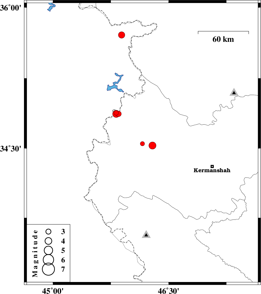 2019/05/25 | 06:02:13.5 | 10:32:13.5 | 34.55 | 46.16 | 12 | ML:2.5 | Kermanshah Province, 27 km -East of Sar-e pol-e zahab | ||