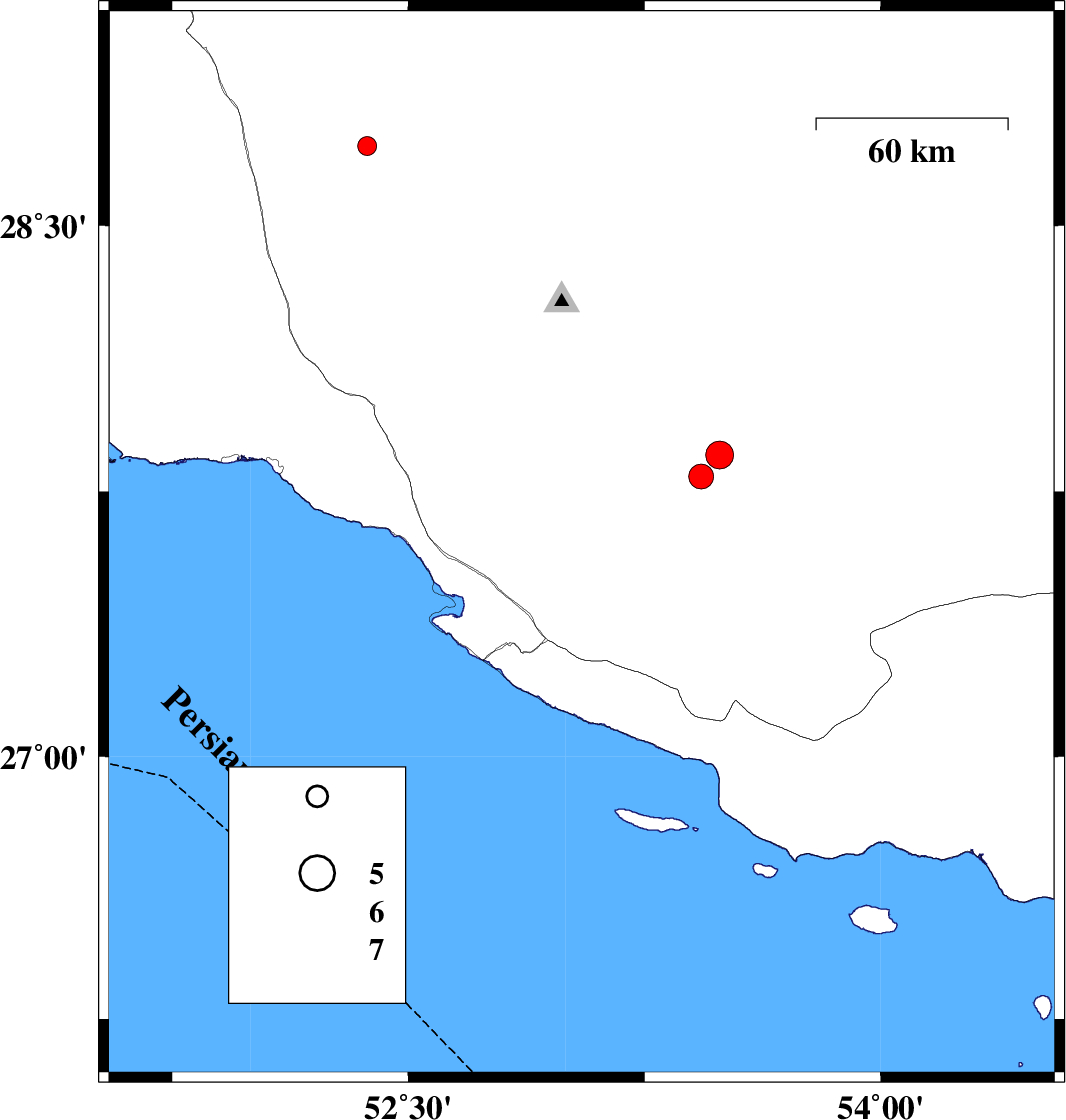 2019/05/19 | 01:29:36.9 | 05:59:36.9 | 28.53 | 51.99 | 5 | ML:2.7 | Bushehr Province, 39 km South of Farashband | ||