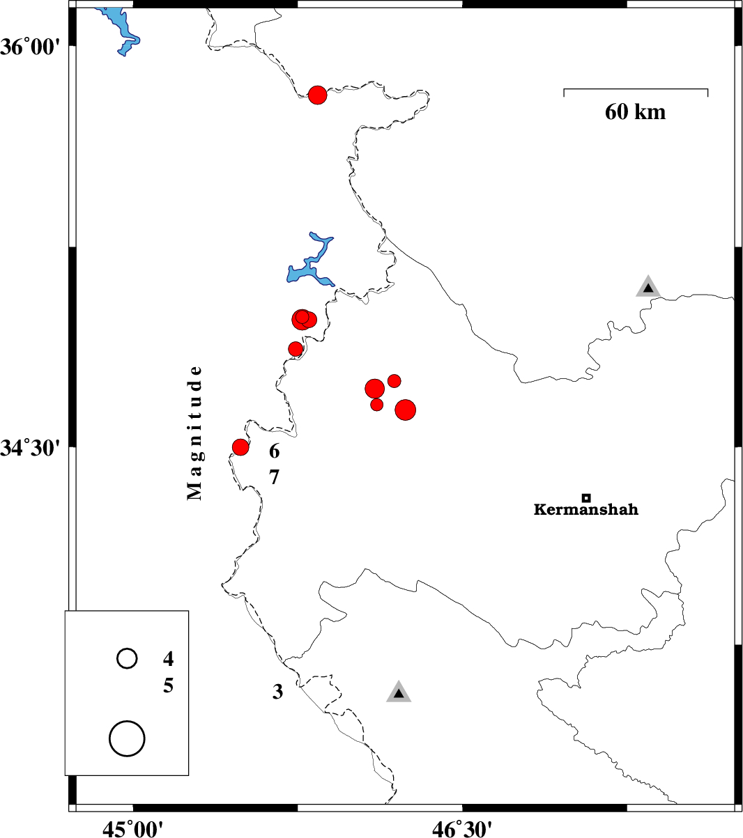 2019/05/25 | 18:31:17.1 | 23:01:17.1 | 34.87 | 45.85 | 7 | ML:3.3 | Kermanshah Province, 12 km North of Tazehabad | ||