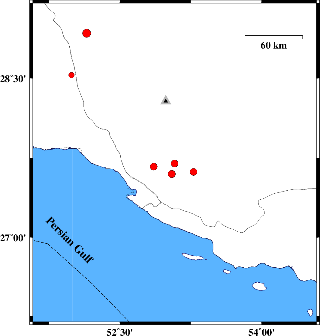 2019/05/19 | 01:29:36.9 | 05:59:36.9 | 28.53 | 51.99 | 5 | ML:2.7 | Bushehr Province, 39 km South of Farashband |