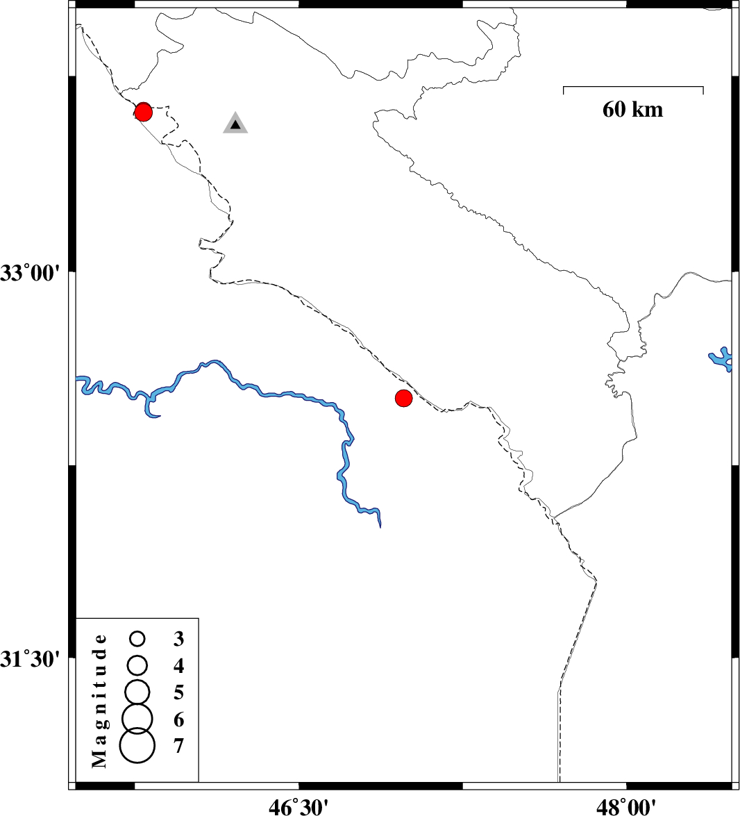 2019/06/15 | 05:38:09.3 | 10:08:09.3 | 32.51 | 46.98 | 10 | ML:3.5 | Iraq, 33 km South-West of Dehloran | ||