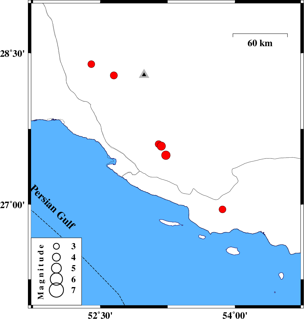 2019/06/24 | 22:35:33.4 | 03:05:33.4 | 26.95 | 53.86 | 14 | Mb:3.5 | Hormozgan Province, 57 km South-West of Bastak | ||