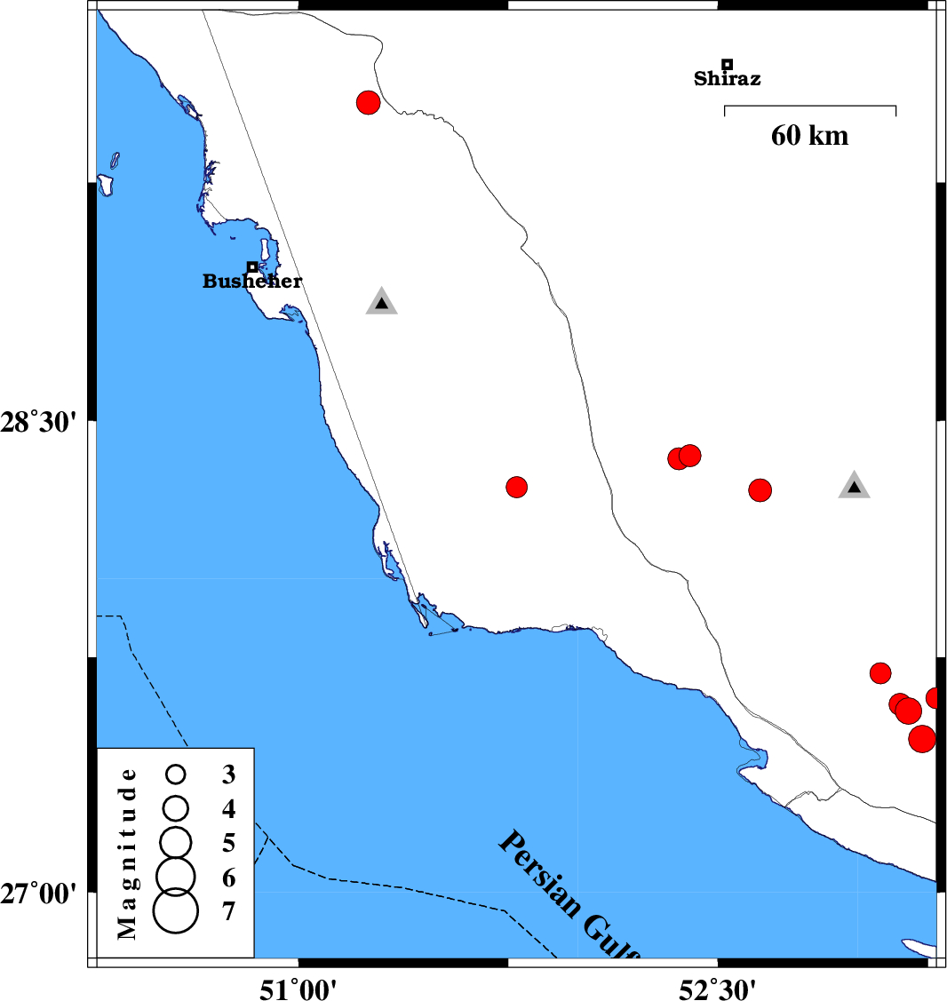 2019/06/22 | 01:34:53.5 | 06:04:53.5 | 29.5 | 51.25 | 10 | ML:3.8 | Bushehr Province, 27 km North of Borazjan | ||