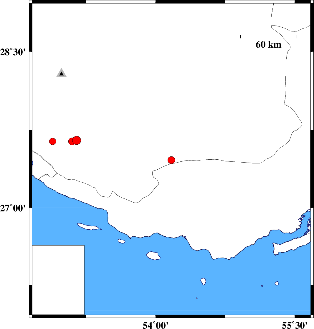 2019/07/19 | 14:03:12.9 | 18:33:12.9 | 27.46 | 54.17 | 20 | ML:3.5 | Fars Province, 30 km South-West of Lar | ||