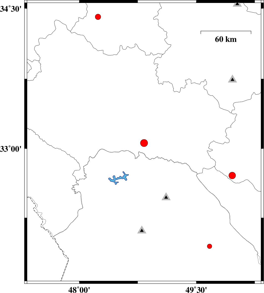 2019/07/21 | 08:24:29.9 | 12:54:29.9 | 33.06 | 48.83 | 19 | ML:4.3 | Lorestan Province, 52 km South-West of Dorud | ||