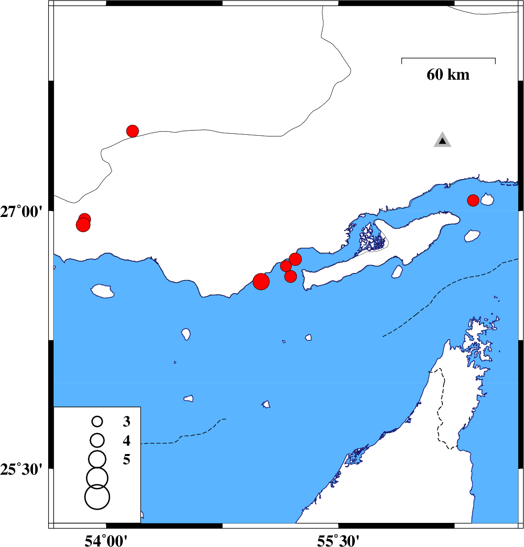 2019/07/22 | 23:20:39.9 | 03:50:39.9 | 26.72 | 55.22 | 14 | ML:3.6 | Persian Gulf, 43 km North-East of Bandar-e lengeh | ||