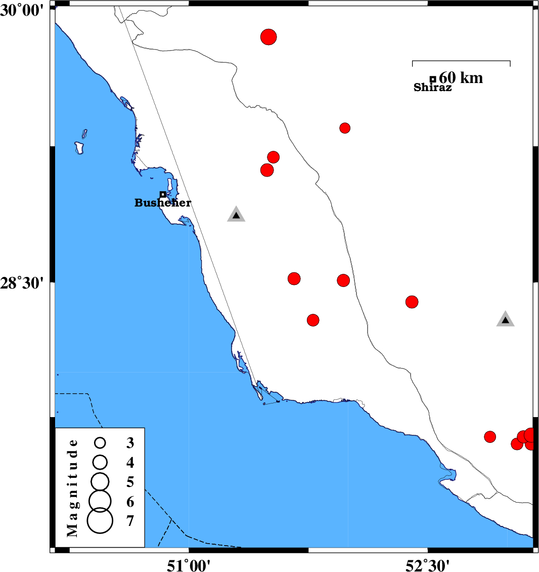 2019/07/11 | 22:02:40.7 | 02:32:40.7 | 29.12 | 51.49 | 8 | ML:3.7 | Bushehr Province, 32 km South-East of Borazjan | ||