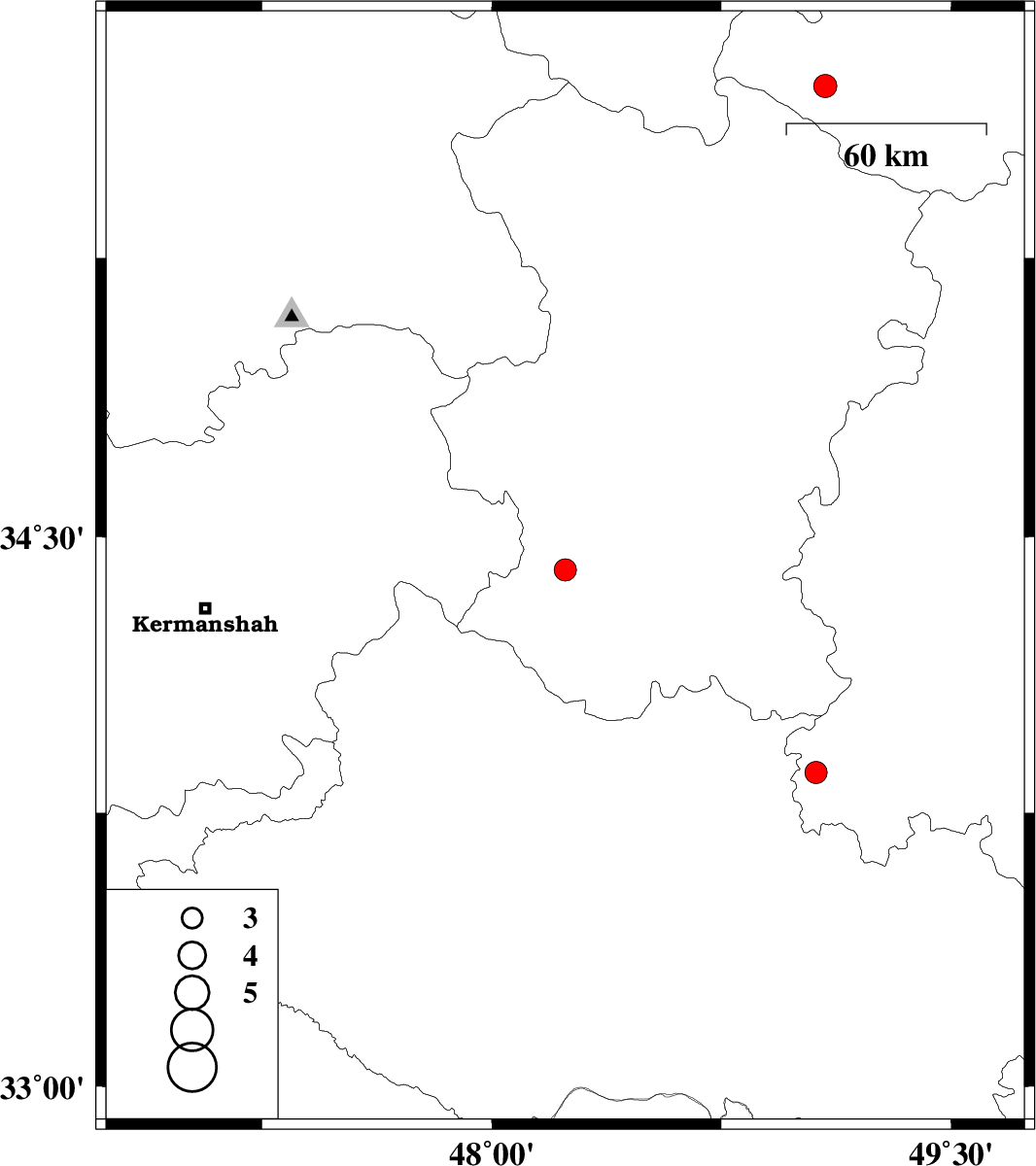 2019/07/16 | 14:03:27.0 | 18:33:27.0 | 34.41 | 48.24 | 10 | ML:3.2 | Hamedan Province, 27 km North-West of Nahavand | ||