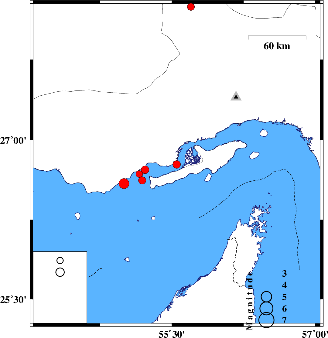 2019/07/22 | 23:20:39.9 | 03:50:39.9 | 26.72 | 55.22 | 14 | ML:3.6 | Persian Gulf, 43 km North-East of Bandar-e lengeh | ||