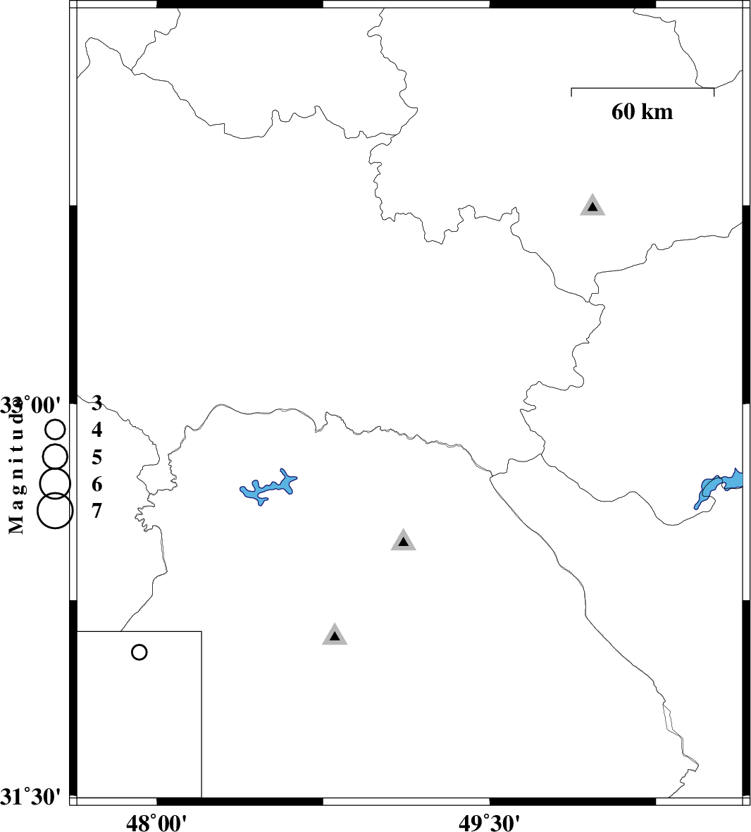 2019/08/13 | 01:26:11.5 | 05:56:11.5 | 32.99 | 49.14 | 19 | ML:3.8 | Lorestan Province, 55 km South of Dorud |