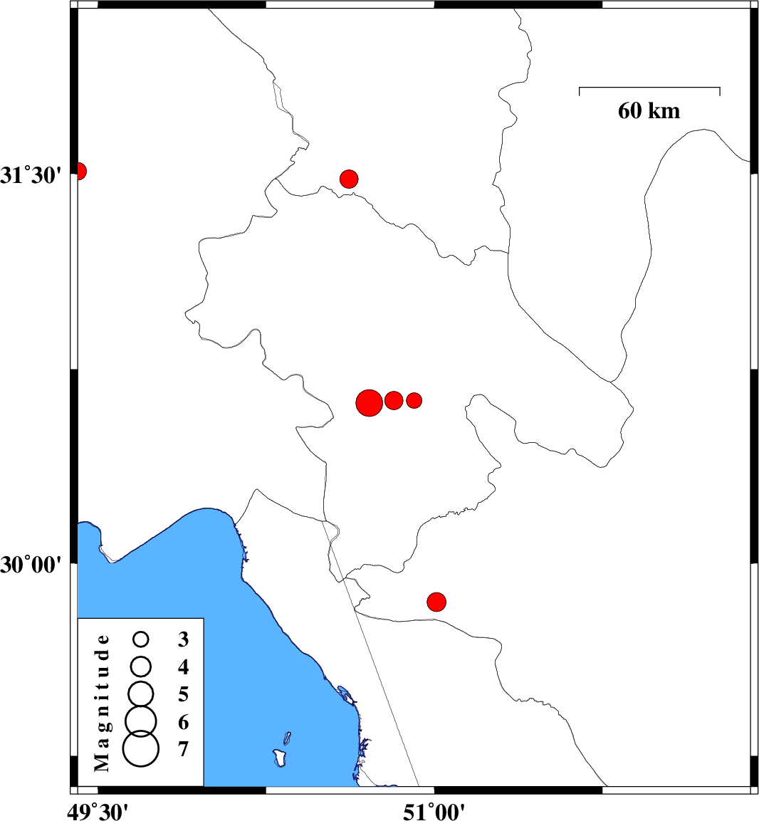 2019/08/04 | 19:51:17.2 | 00:21:17.2 | 30.62 | 50.71 | 9 | ML:5.4 | Kohkiluieh va boyerahmad Province, 23 km South-East of Dehdasht | ||
