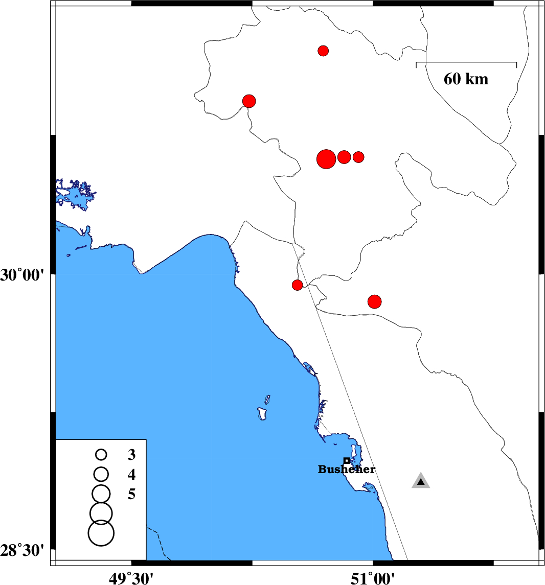 2019/08/29 | 14:56:57.6 | 19:26:57.6 | 29.94 | 50.53 | 10 | ML:3 | Khoozestan Province, 41 km North of Bandar-e genaveh | ||