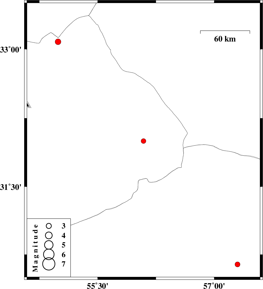 2019/08/29 | 17:02:55.1 | 21:32:55.1 | 30.64 | 57.3 | 15 | ML:3 | Kerman Province, 45 km North-East of Kerman | ||