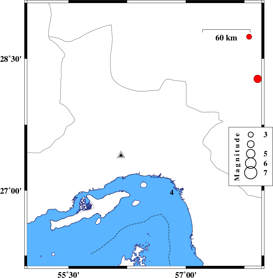 2019/09/09 | 16:54:16.2 | 21:24:16.2 | 27.84 | 55.23 | 14 | ML:3.1 | Fars Province, 89 km North-East of Lar | ||