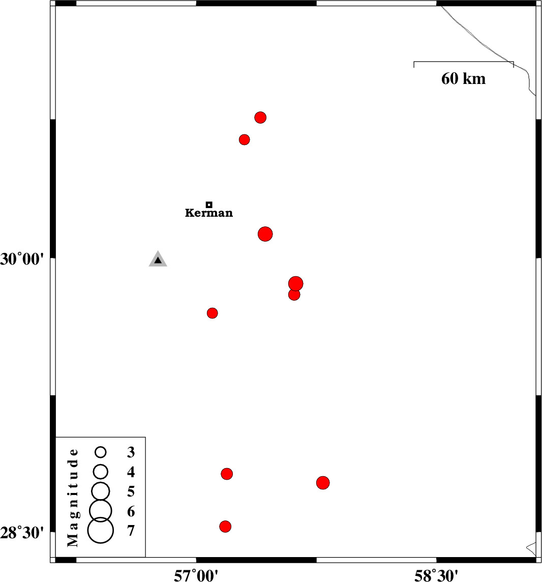2019/09/13 | 03:33:00.7 | 08:03:00.7 | 30.76 | 57.4 | 14 | ML:3.2 | Kerman Province, 61 km North-East of Kerman | ||