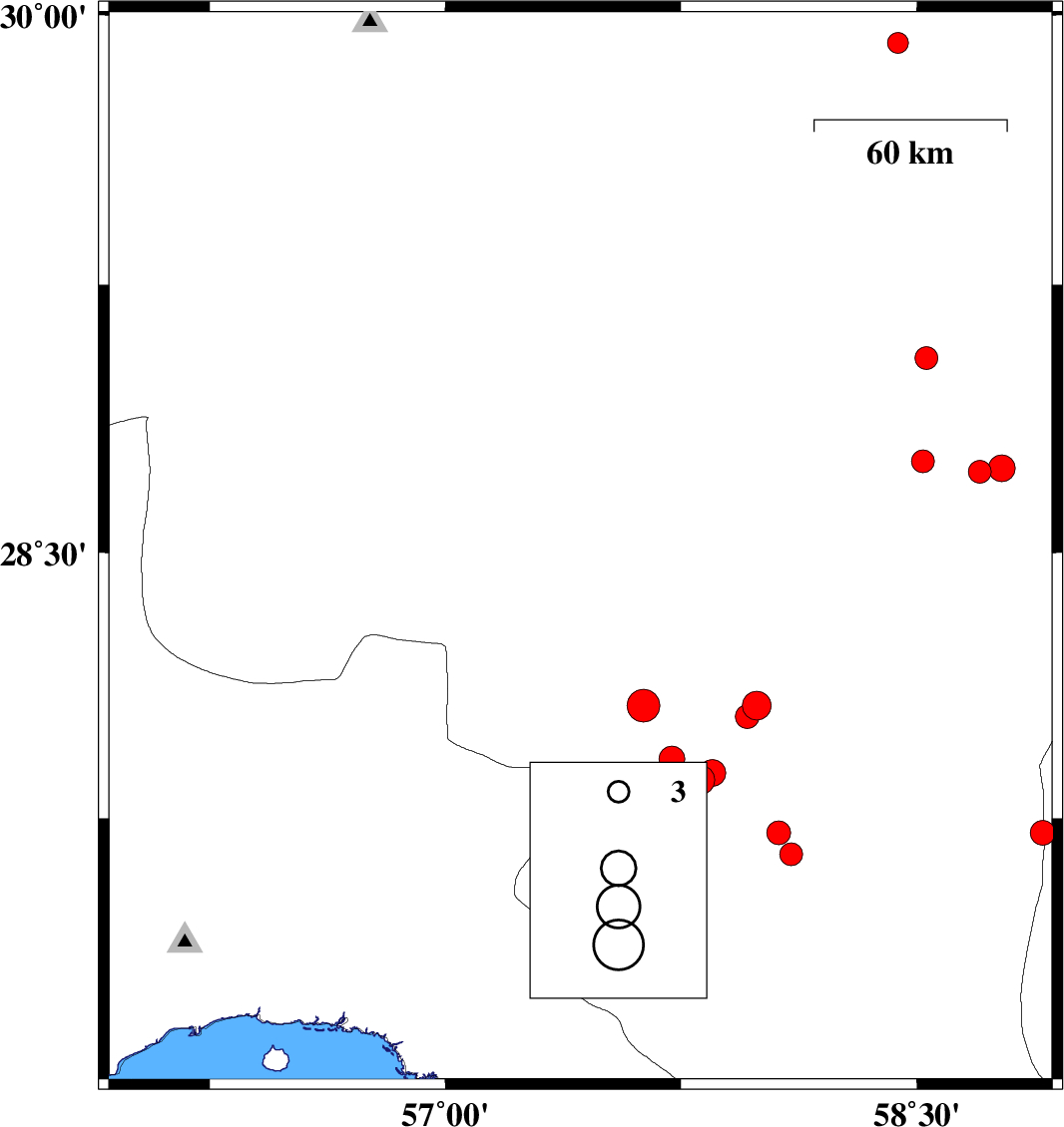 2019/09/13 | 21:05:43.2 | 01:35:43.2 | 29.7 | 57.1 | 11 | ML:3 | Kerman Province, 65 km South of Kerman | ||