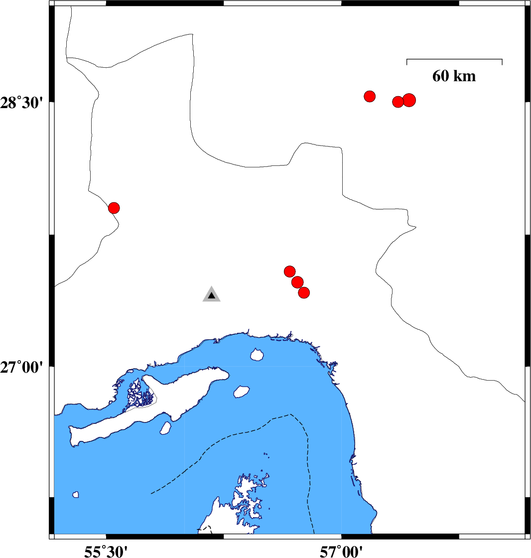 2019/09/19 | 11:07:25.8 | 15:37:25.8 | 28.53 | 57.18 | 14 | ML:3.3 | Kerman Province, 57 km South-West of Jiroft |