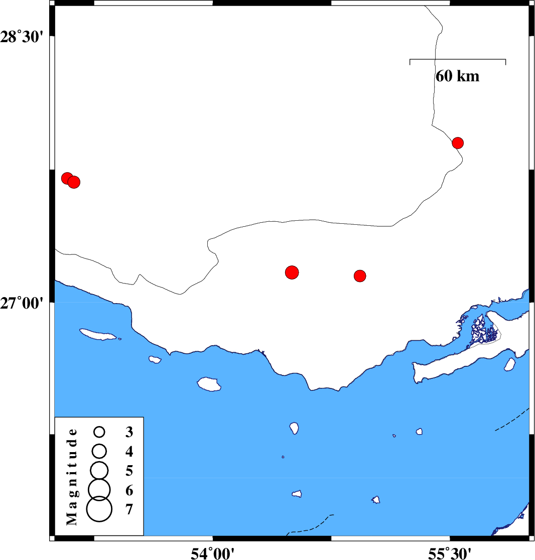 2019/09/26 | 04:45:18.8 | 08:15:18.8 | 27.17 | 54.5 | 14 | ML:3.8 | Hormozgan Province, 14 km -East of Bastak | ||