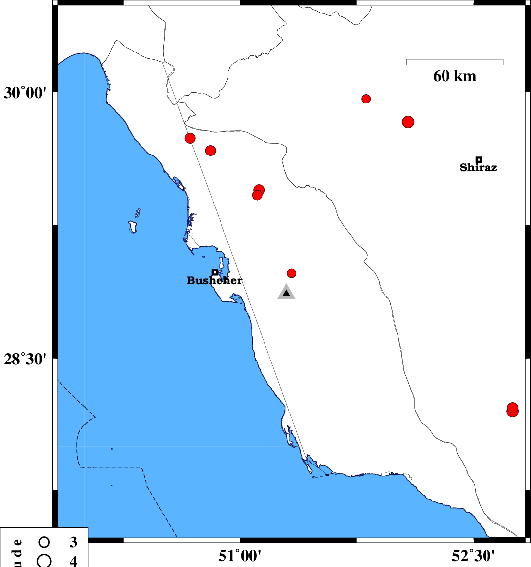 2019/10/12 | 20:53:26.1 | 00:23:26.1 | 28.98 | 51.33 | 5 | ML:2.6 | Bushehr Province, 13 km North of Ahram | ||