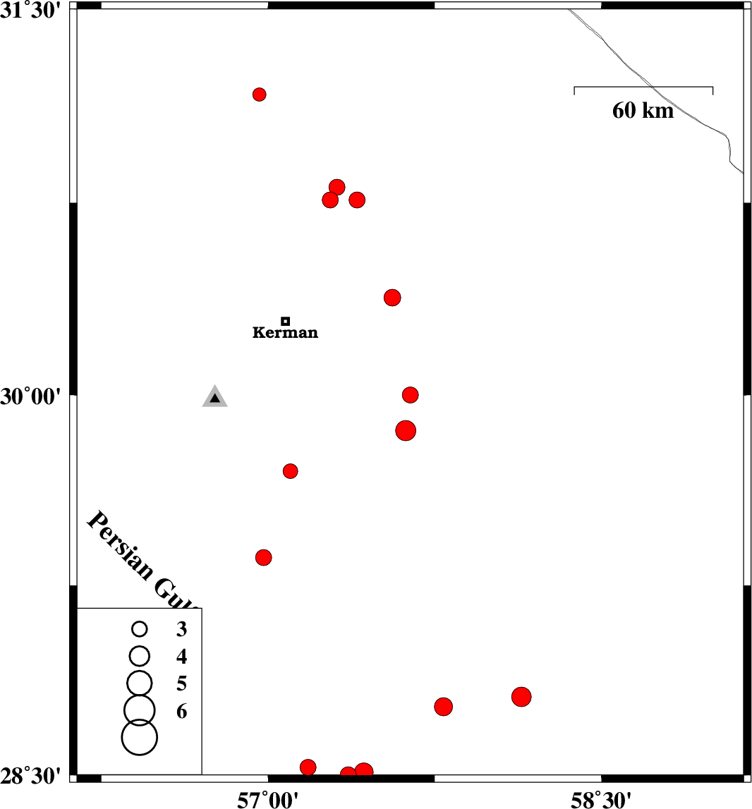 2019/09/13 | 03:33:00.7 | 08:03:00.7 | 30.76 | 57.4 | 14 | ML:3.2 | Kerman Province, 61 km North-East of Kerman |