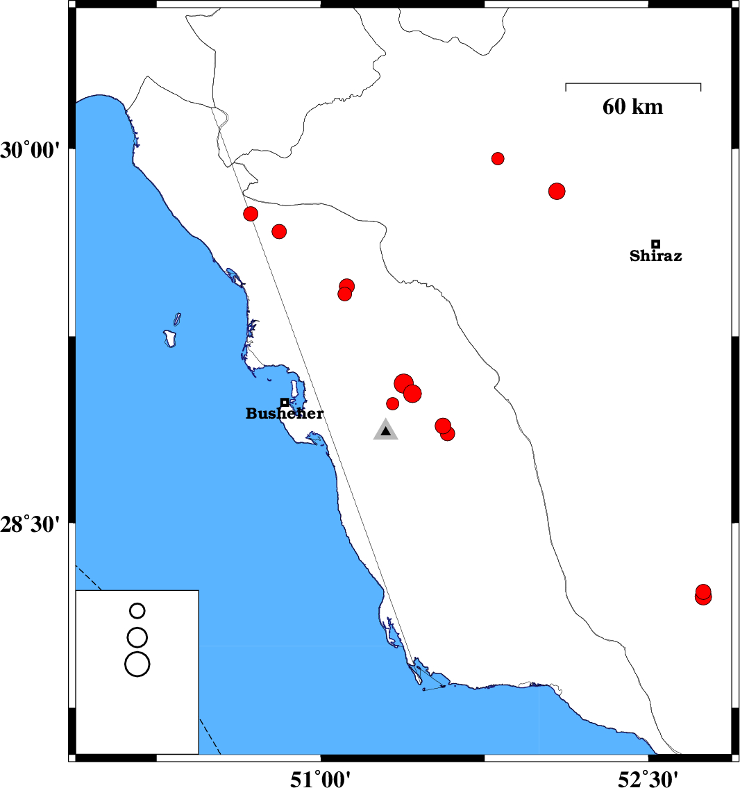 2019/10/05 11:49:59.6 15:19:59.6 29.7450.6814 ML:3 Bushehr Province, 24 km North-East of Bandar-e genaveh