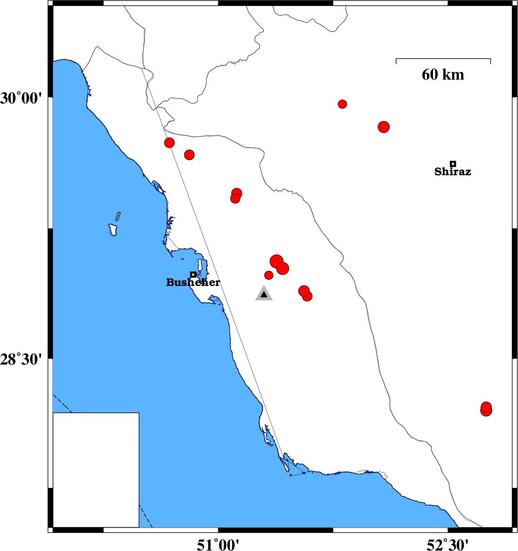 2019/10/12 | 20:53:26.1 | 00:23:26.1 | 28.98 | 51.33 | 5 | ML:2.6 | Bushehr Province, 13 km North of Ahram | ||