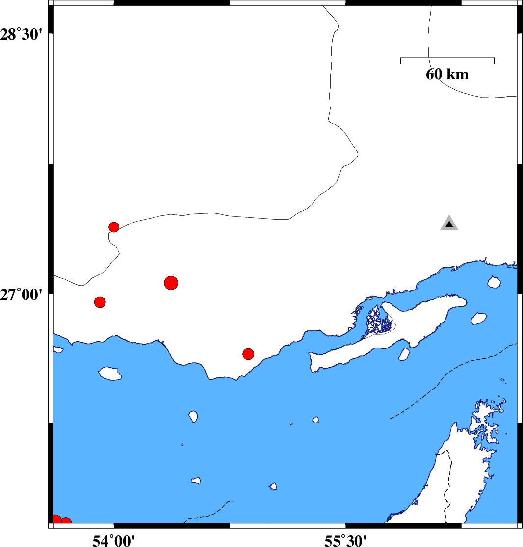 2019/10/18 | 07:42:31.6 | 11:12:31.6 | 26.58 | 55.31 | 14 | ML:3.3 | Persian Gulf, 46 km -East of Bandar-e lengeh | ||
