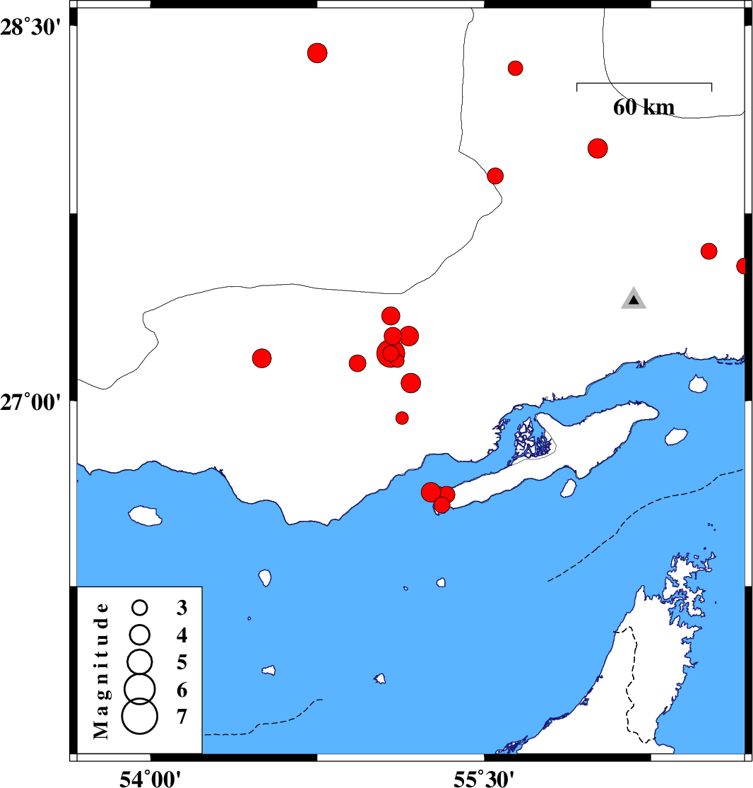 2019/10/18 | 04:09:38.8 | 07:39:38.8 | 26.63 | 55.26 | 14 | ML:4 | Persian Gulf, 42 km North-East of Bandar-e lengeh | ||