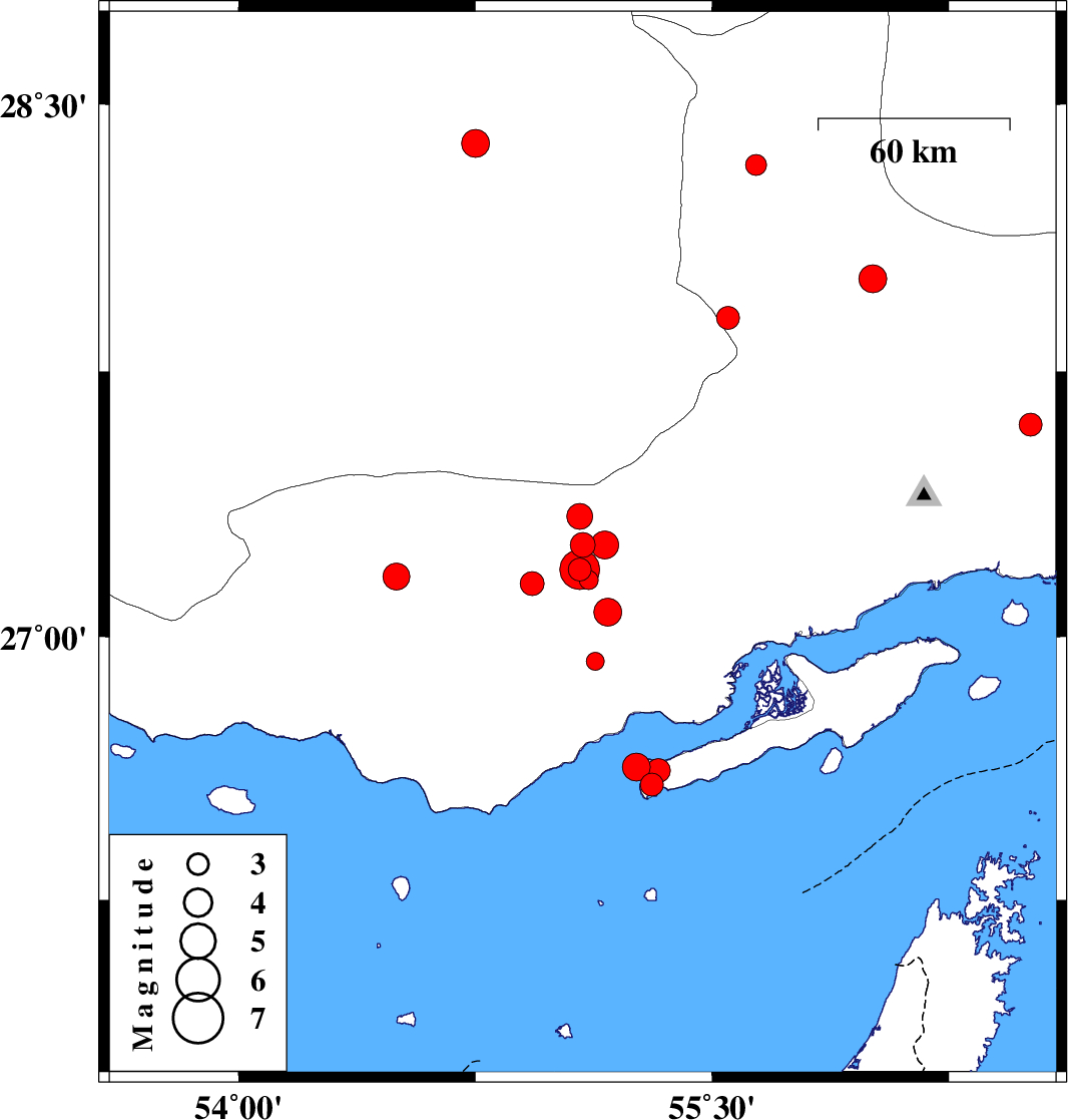2019/10/22 | 04:33:20.1 | 08:03:20.1 | 27.07 | 55.17 | 14 | ML:3.9 | Hormozgan Province, 68 km North-East of Bandar-e lengeh | ||