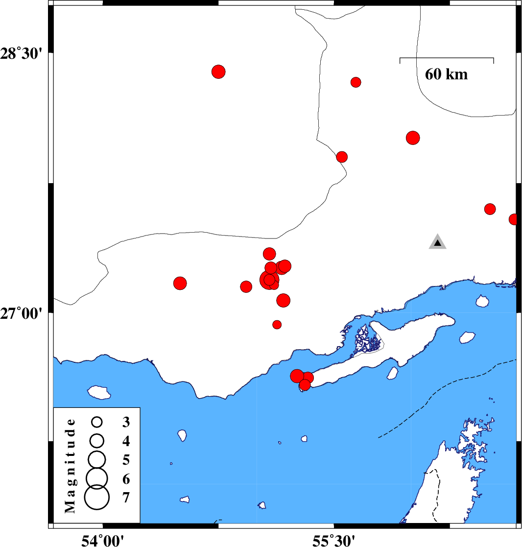 2019/10/22 | 04:33:20.1 | 08:03:20.1 | 27.07 | 55.17 | 14 | ML:3.9 | Hormozgan Province, 68 km North-East of Bandar-e lengeh | ||