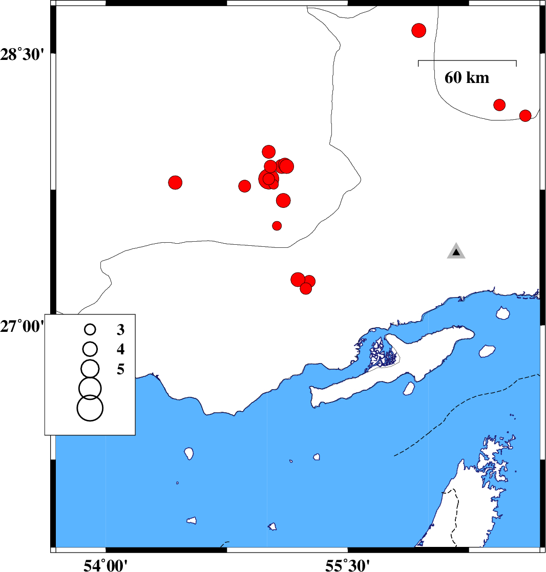 2019/10/22 | 04:33:20.1 | 08:03:20.1 | 27.07 | 55.17 | 14 | ML:3.9 | Hormozgan Province, 68 km North-East of Bandar-e lengeh | ||