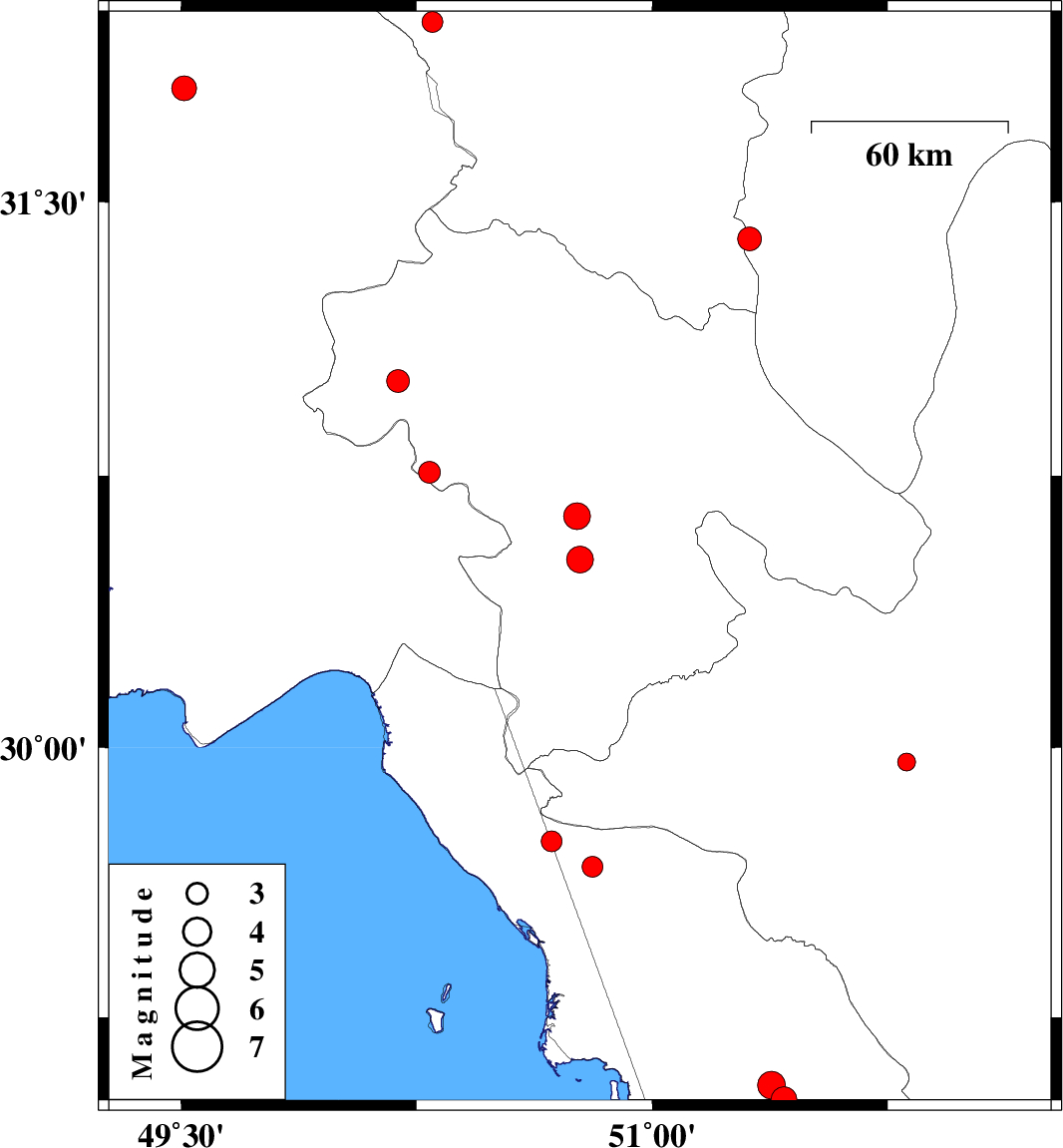 2019/10/18 | 03:00:12.0 | 06:30:12.0 | 29.06 | 51.38 | 10 | ML:4 | Bushehr Province, 23 km North-East of Ahram | ||