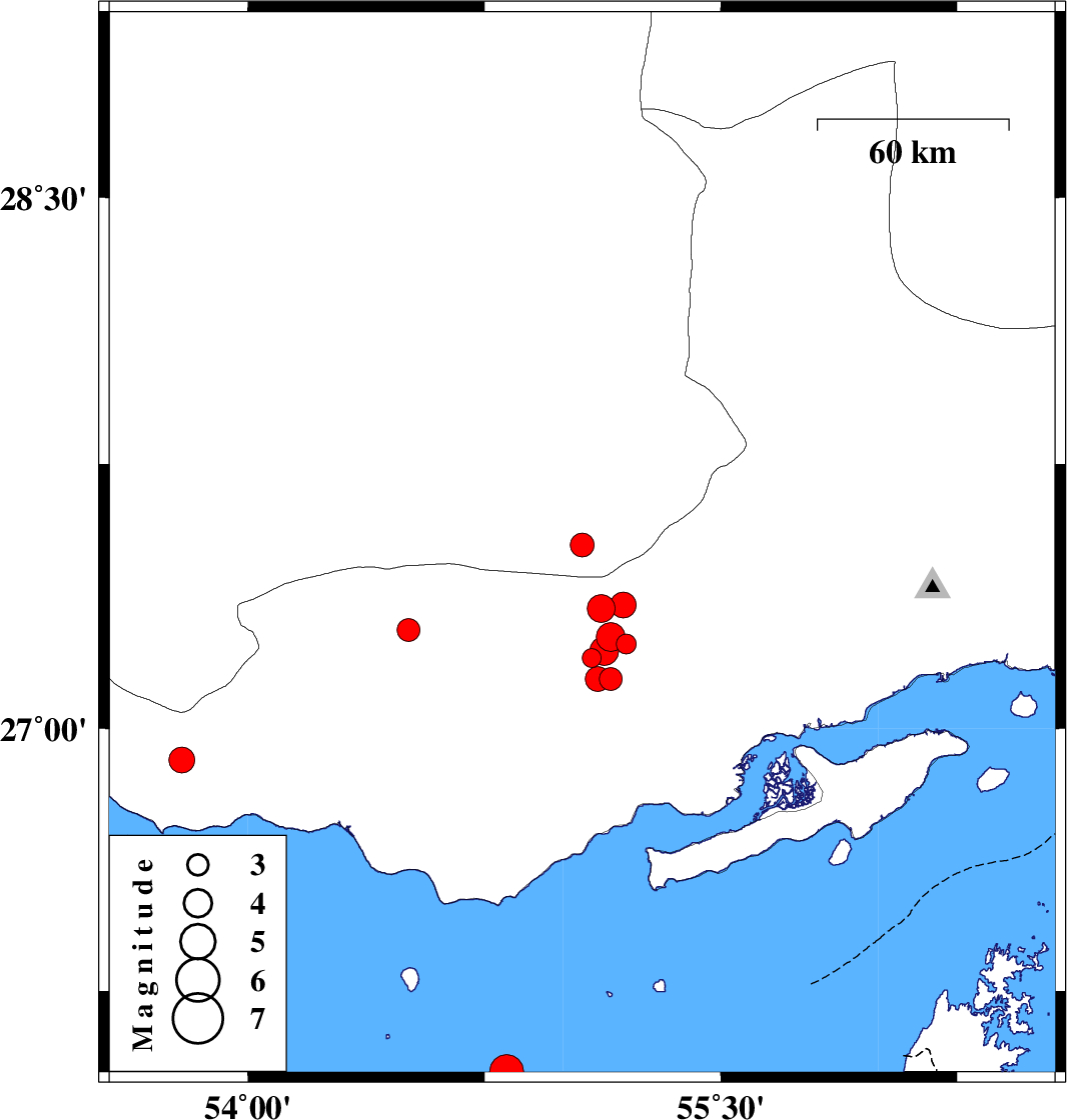 2019/10/31 | 15:43:58.5 | 19:13:58.5 | 26.02 | 54.82 | 10 | ML:4.8 | Persian Gulf, 27 km North-West of Abu Musa | ||