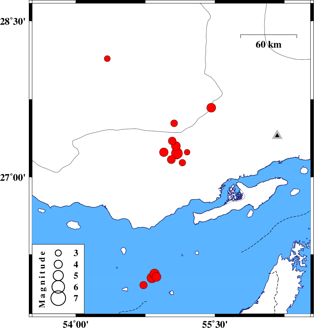 2019/10/31 | 15:43:58.5 | 19:13:58.5 | 26.02 | 54.82 | 10 | ML:4.8 | Persian Gulf, 27 km North-West of Abu Musa |