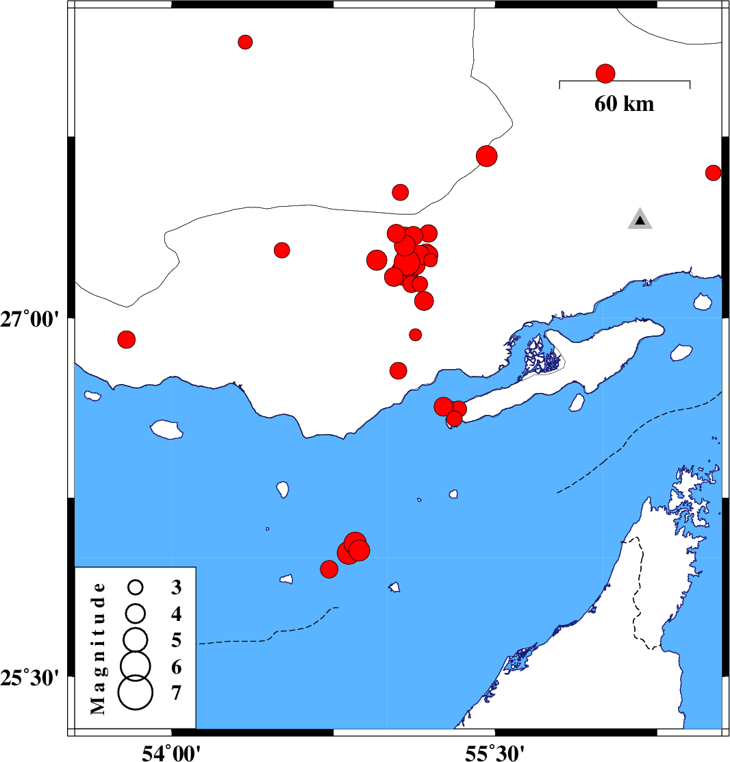 2019/11/04 | 00:18:40.9 | 03:48:40.9 | 26.06 | 54.85 | 14 | ML:4.6 | Persian Gulf, 28 km North-West of Abu Musa | ||