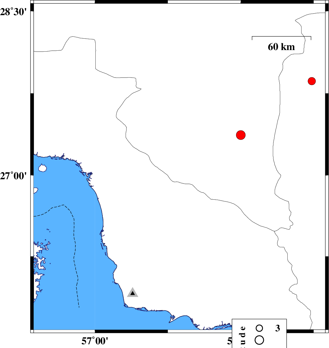 2019/11/11 | 07:23:30.5 | 10:53:30.5 | 27.04 | 57.91 | 14 | ML:3.3 | Kerman Province, 58 km South-East of Manujan | ||