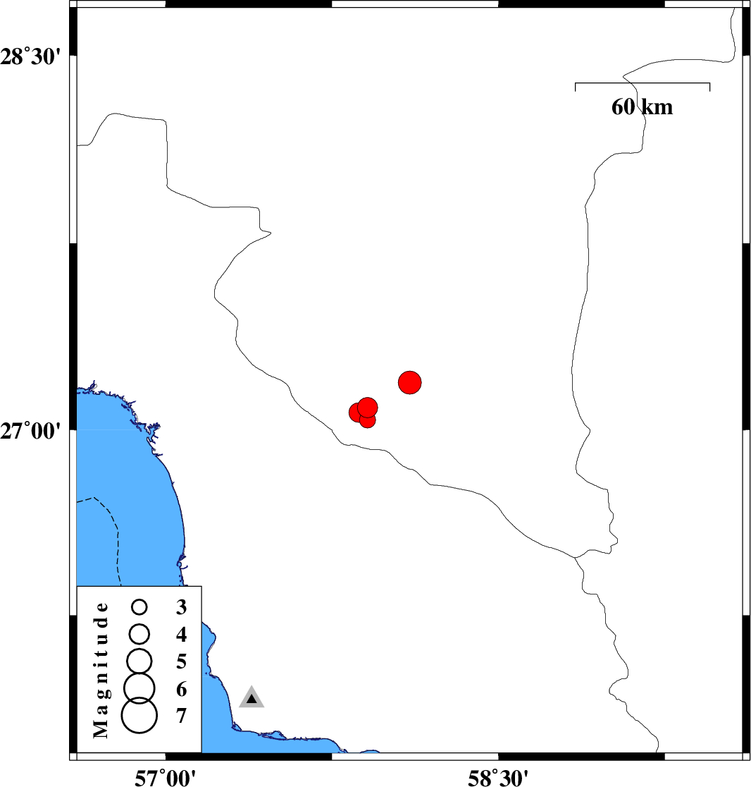 2019/11/11 | 00:12:29.8 | 03:42:29.8 | 27.07 | 57.87 | 14 | ML:4 | Kerman Province, 53 km South-East of Manujan |
