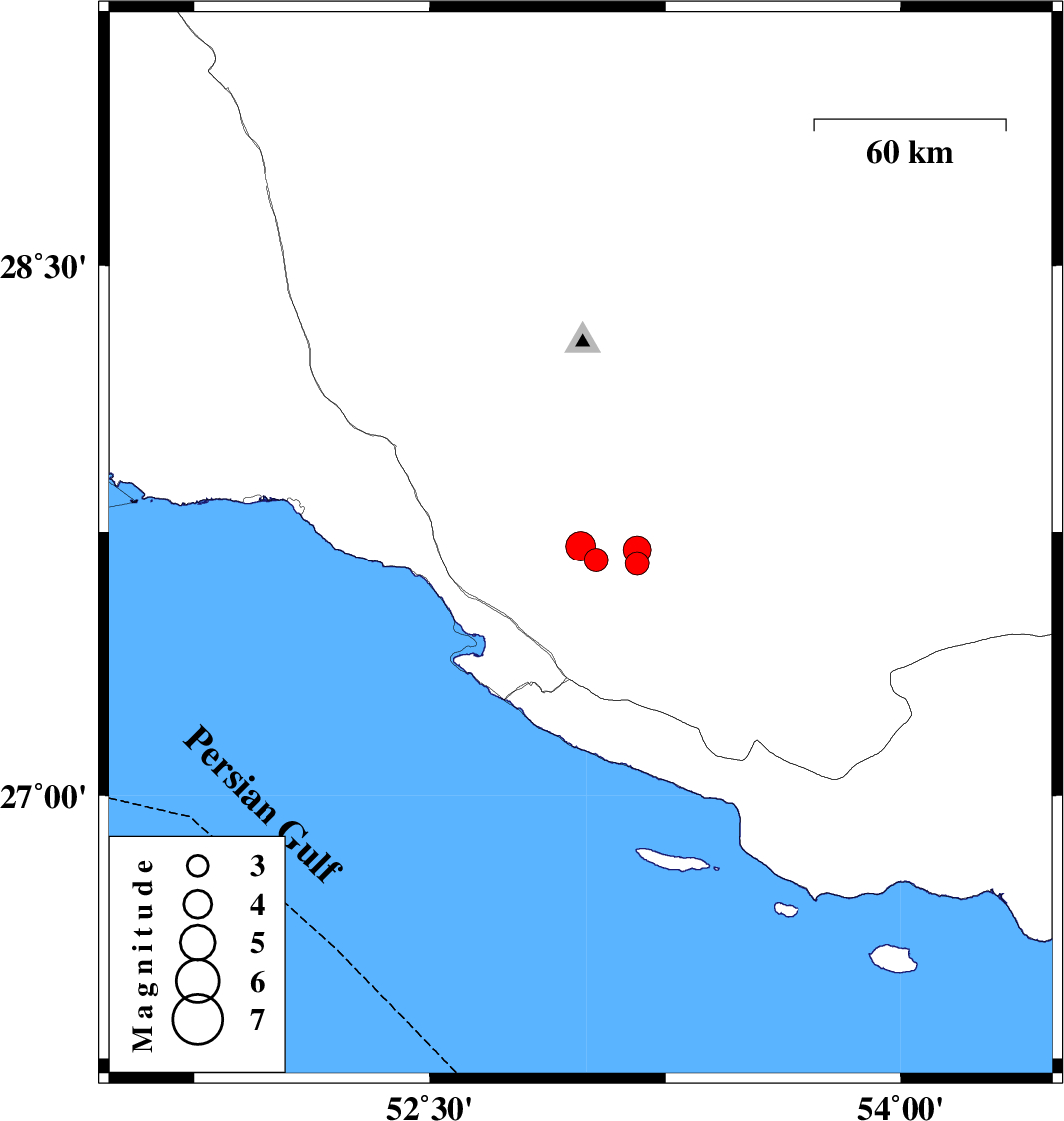 2019/11/13 | 17:57:46.5 | 21:27:46.5 | 27.71 | 52.98 | 12 | ML:4.2 | Fars Province, 20 km North of Mehr | ||