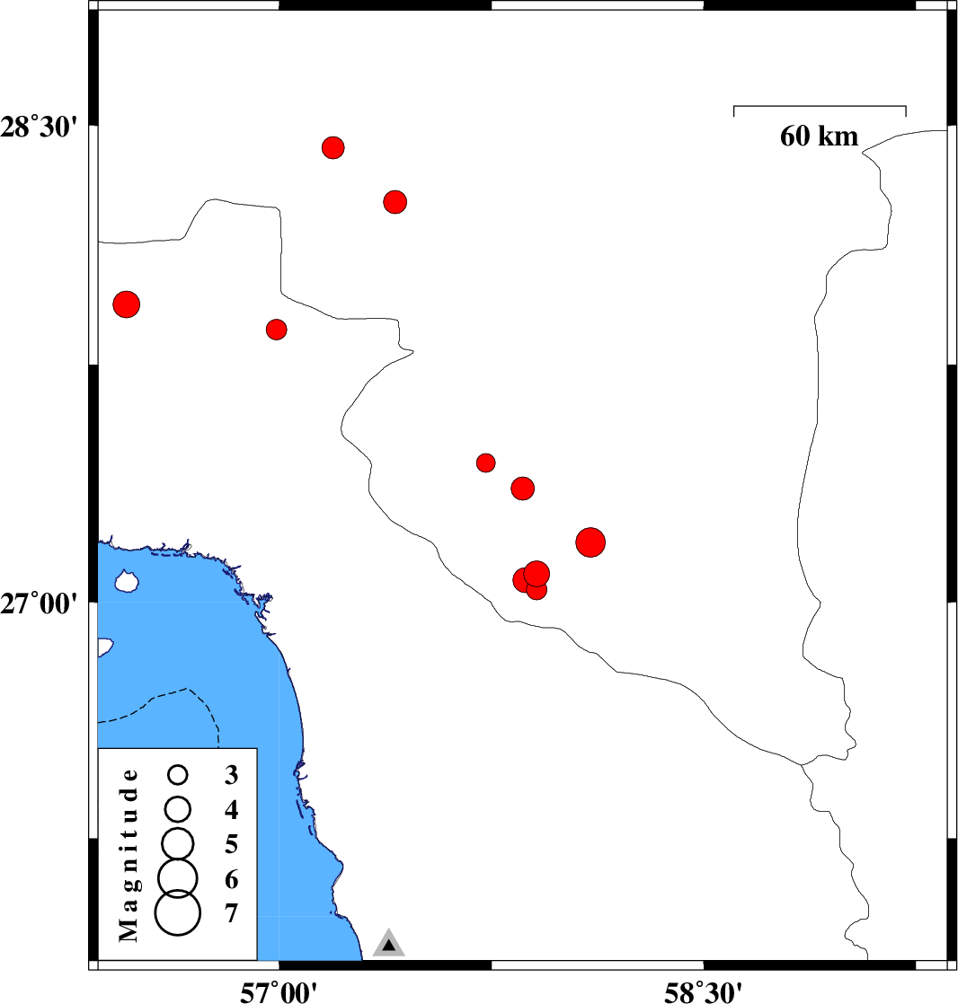 2019/10/19 | 04:56:56.6 | 08:26:56.6 | 28.26 | 57.41 | 14 | ML:3.6 | Kerman Province, 44 km North-West of Kahnuj | ||