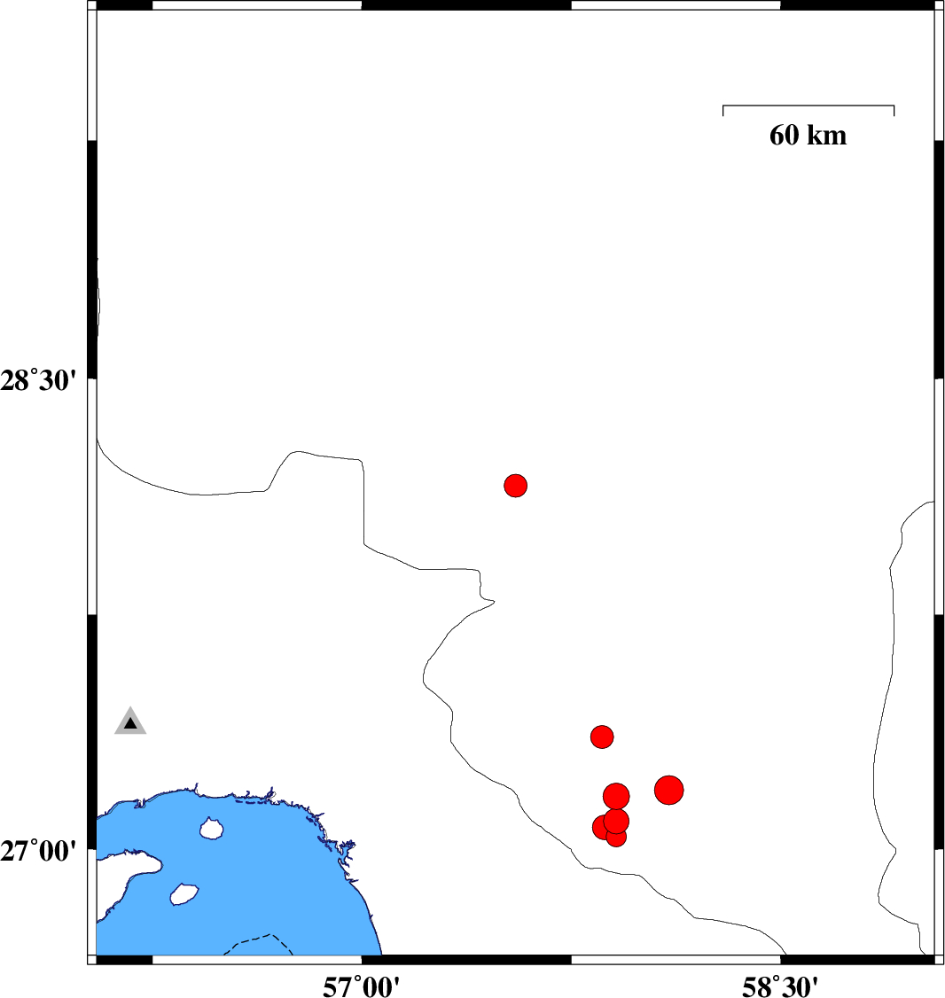 2019/11/11 | 00:12:29.8 | 03:42:29.8 | 27.07 | 57.87 | 14 | ML:4 | Kerman Province, 53 km South-East of Manujan |