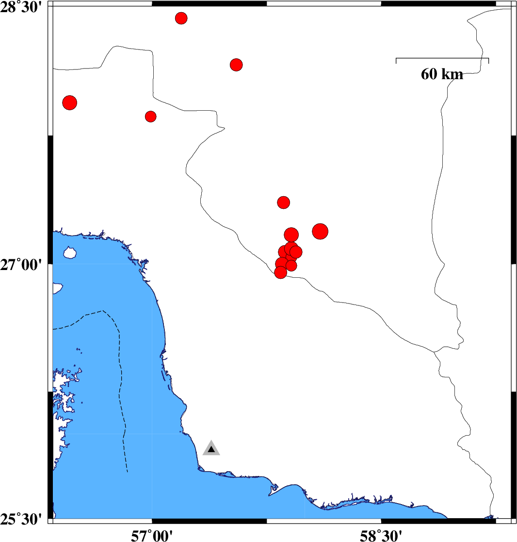 2019/11/18 | 08:08:59.6 | 11:38:59.6 | 28.16 | 57.55 | 14 | ML:3.6 | Kerman Province, 27 km North-West of Kahnuj | ||
