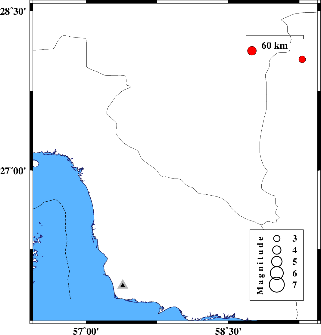 2019/11/15 | 01:51:17.5 | 05:21:17.5 | 27.17 | 57.91 | 10 | ML:4.3 | Kerman Province, 49 km South-East of Manujan | ||