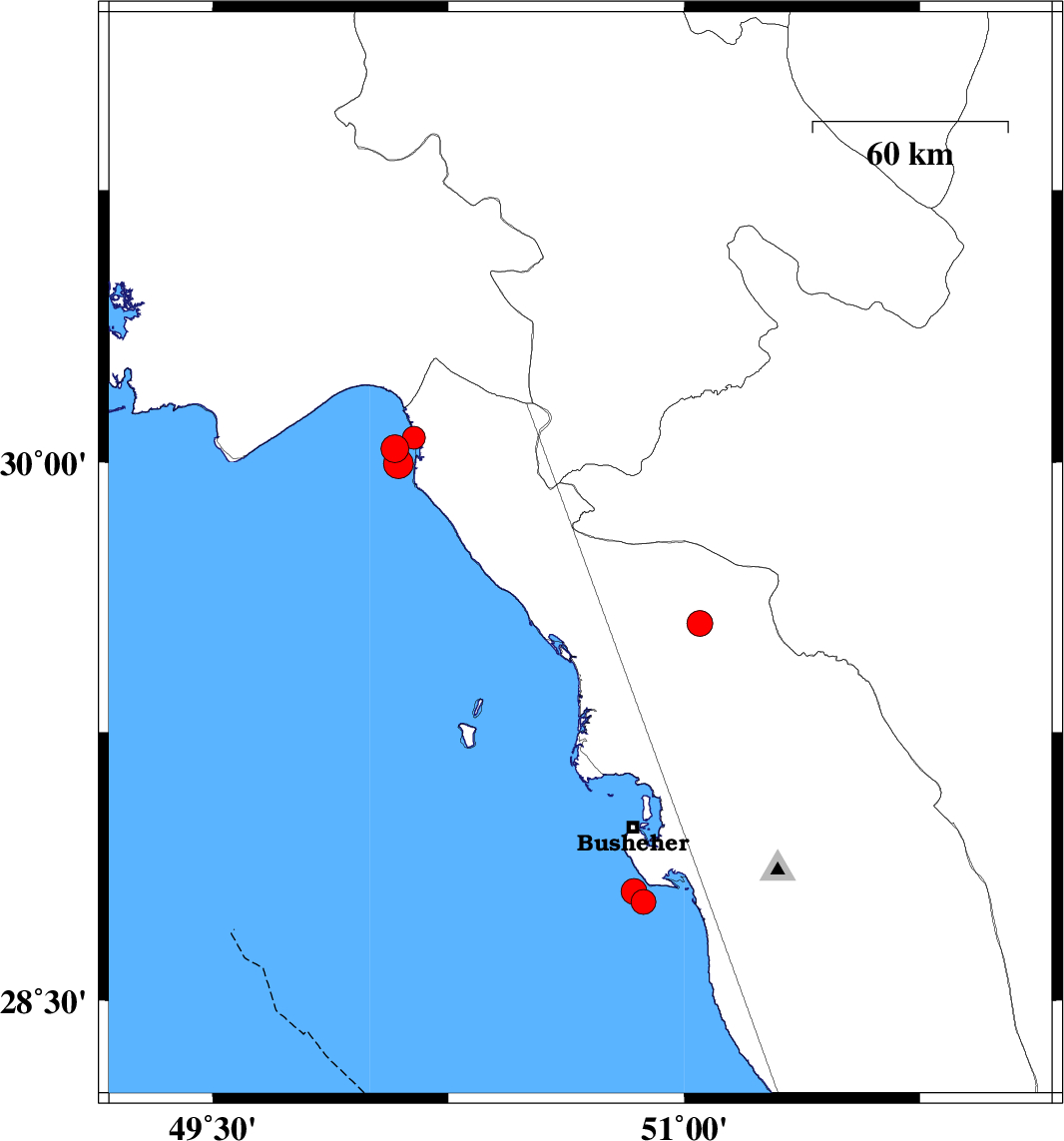 2019/11/25 | 12:30:52.1 | 16:00:52.1 | 29.77 | 50.64 | 14 | ML:3.6 | Bushehr Province, 25 km North-East of Bandar-e genaveh | ||