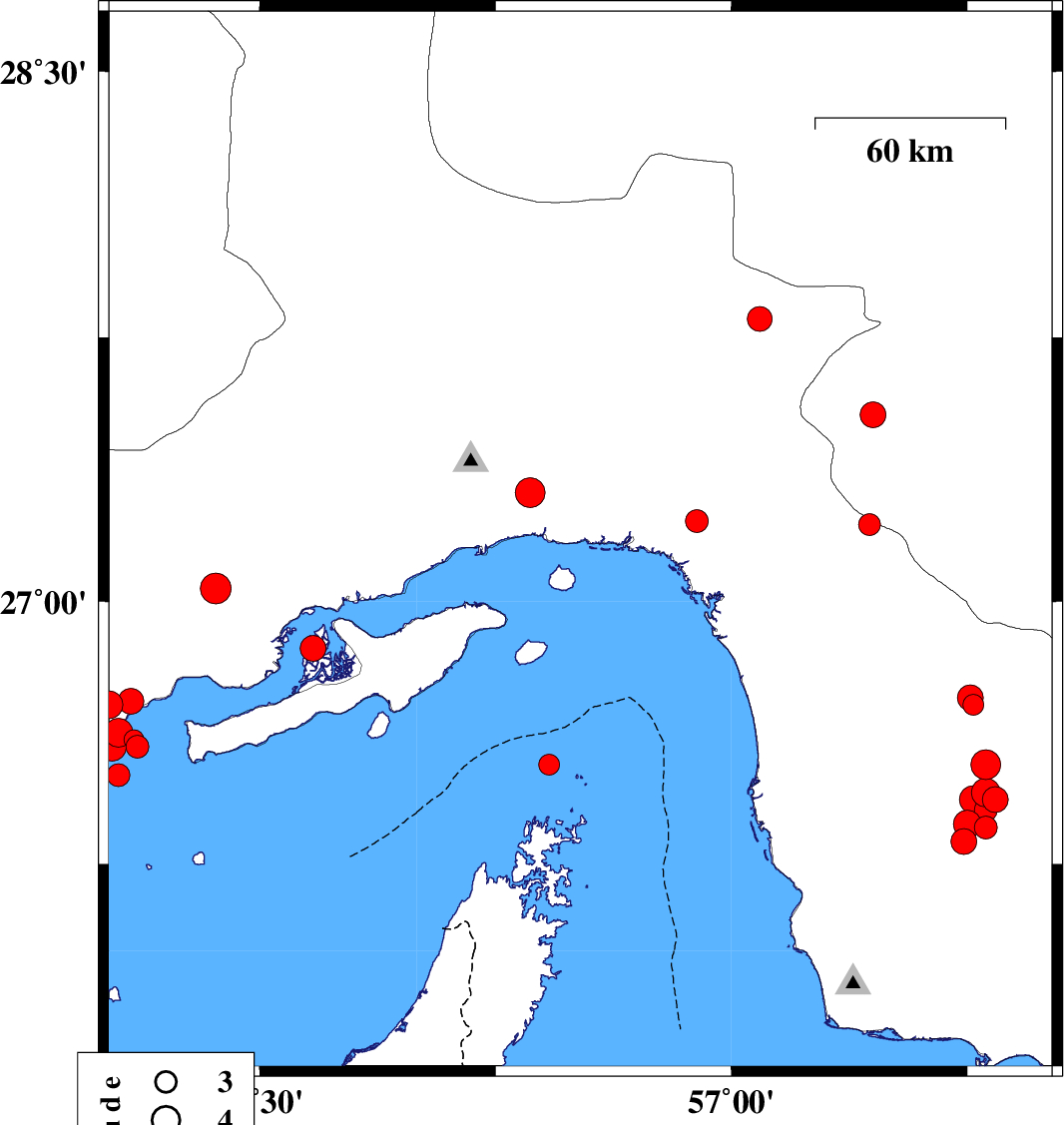 2019/11/12 | 03:24:57.2 | 06:54:57.2 | 27.22 | 55.21 | 14 | ML:3.3 | Hormozgan Province, 84 km -East of Bastak | ||